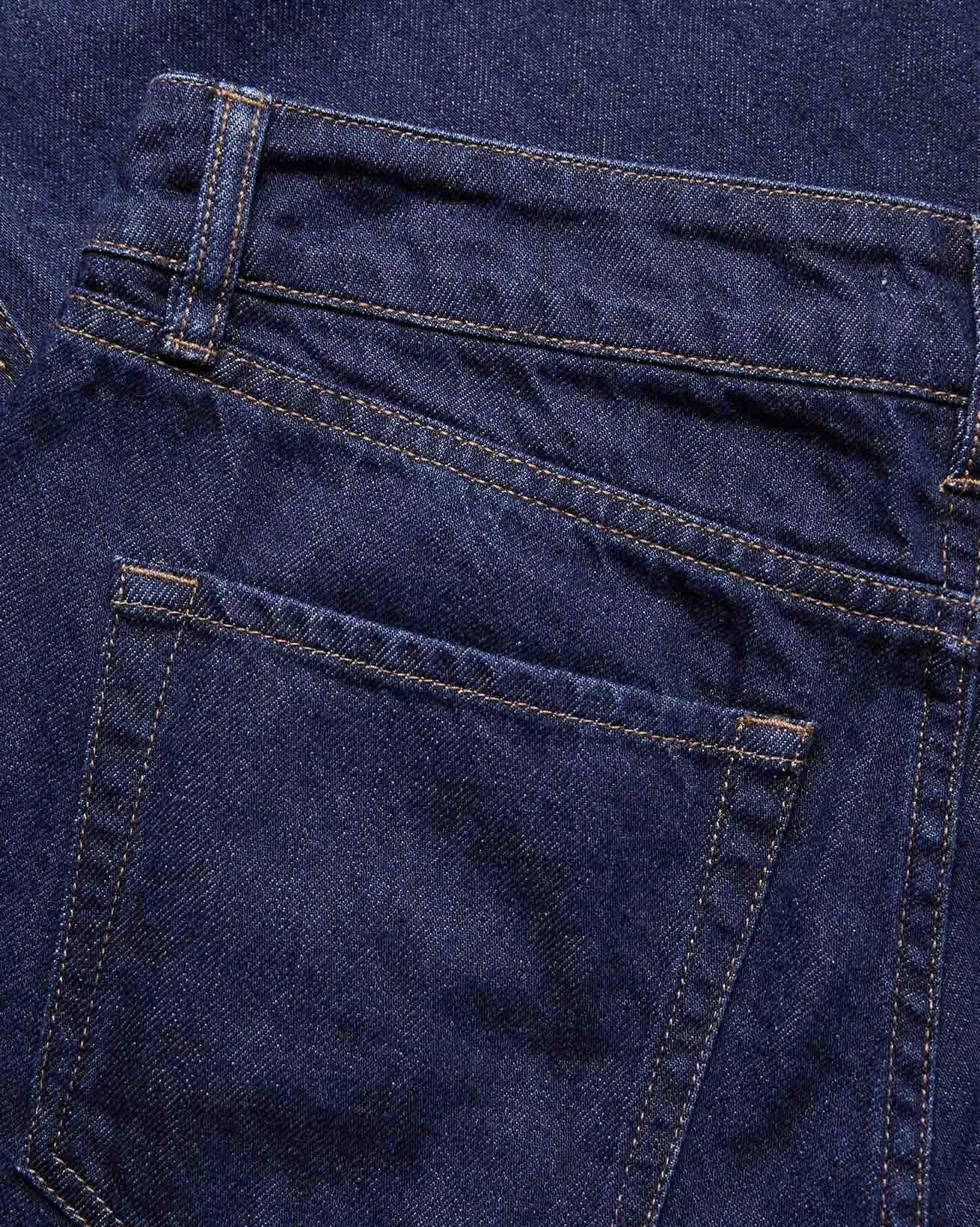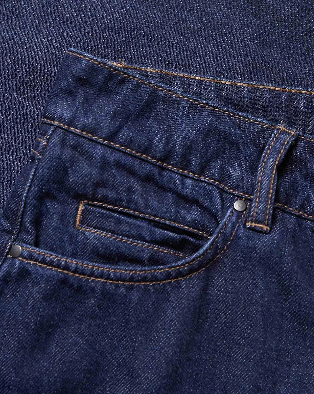 Indigo denim in a classic, non-stretch weave. The garment has been washed to reveal varied shades of blue, adding depth and character to the fabric.