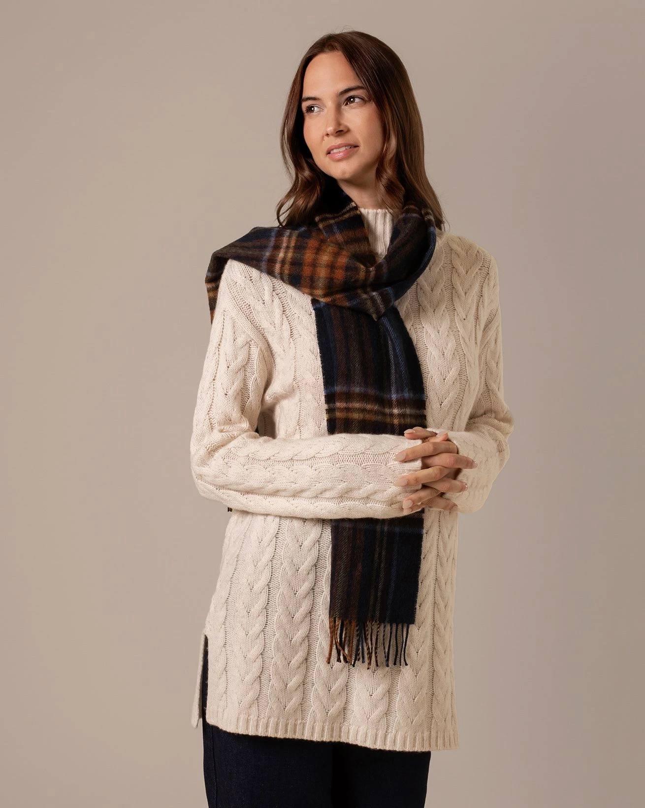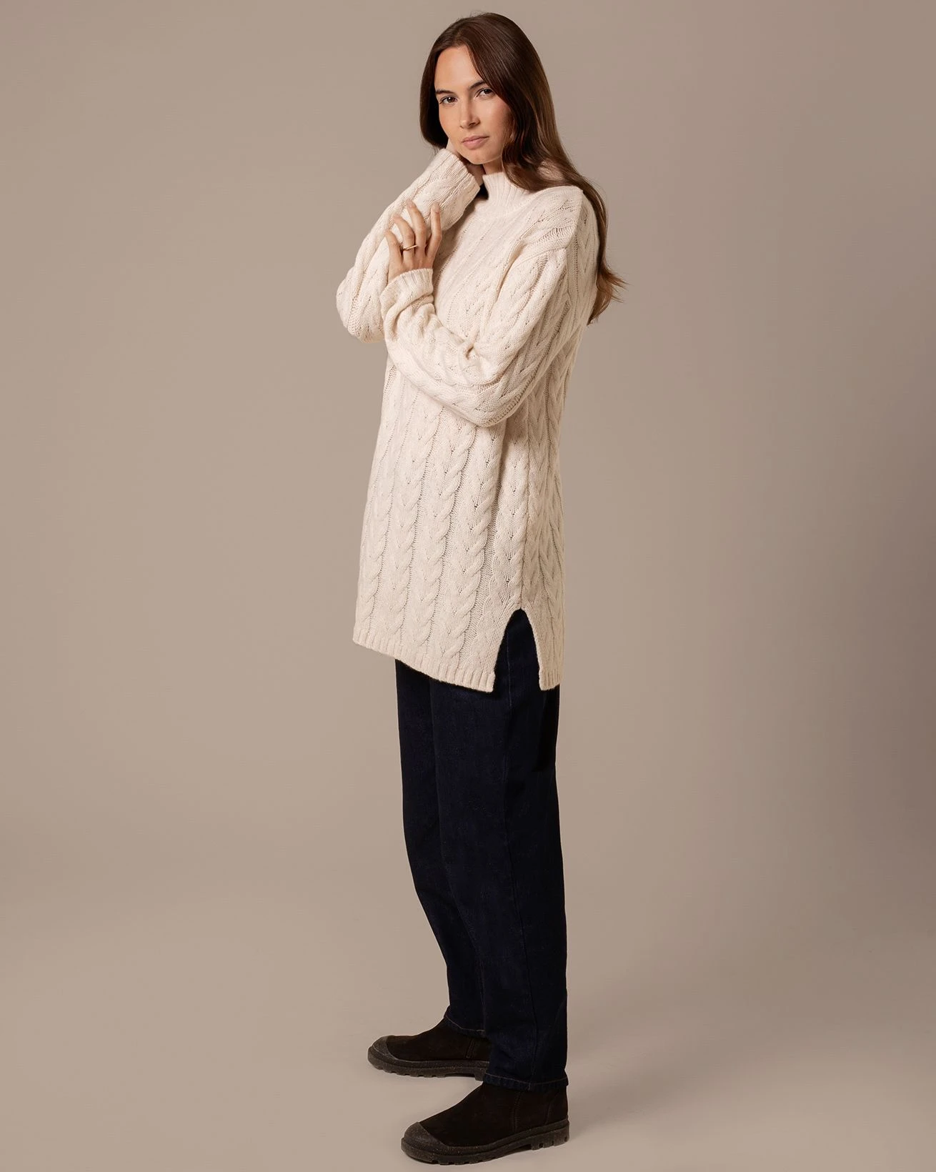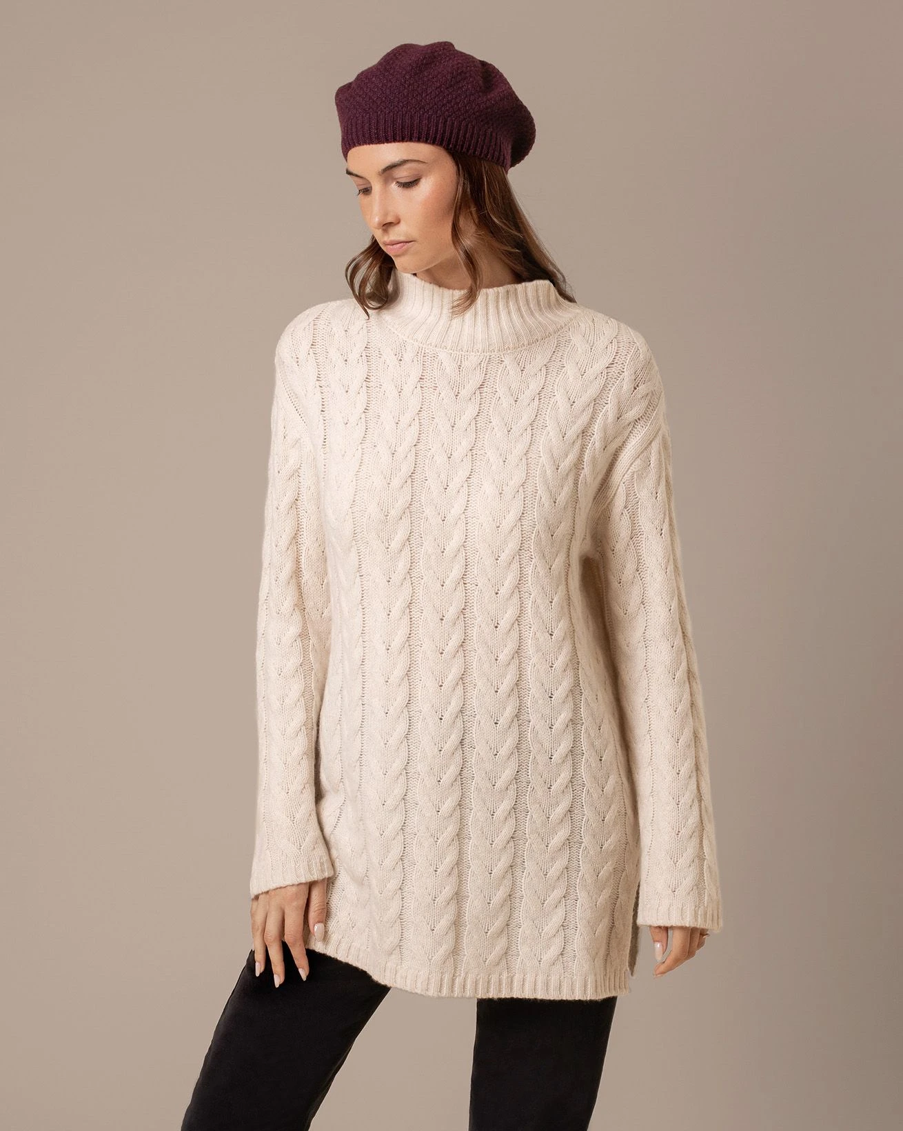 Crafted in pure lambswool, this tunic features an all-over cable design inspired by traditional Aran patterns. The funnel neckline adds warmth and structure, while the longer length offers comfortable coverage. A refined piece for layering in cooler seasons.