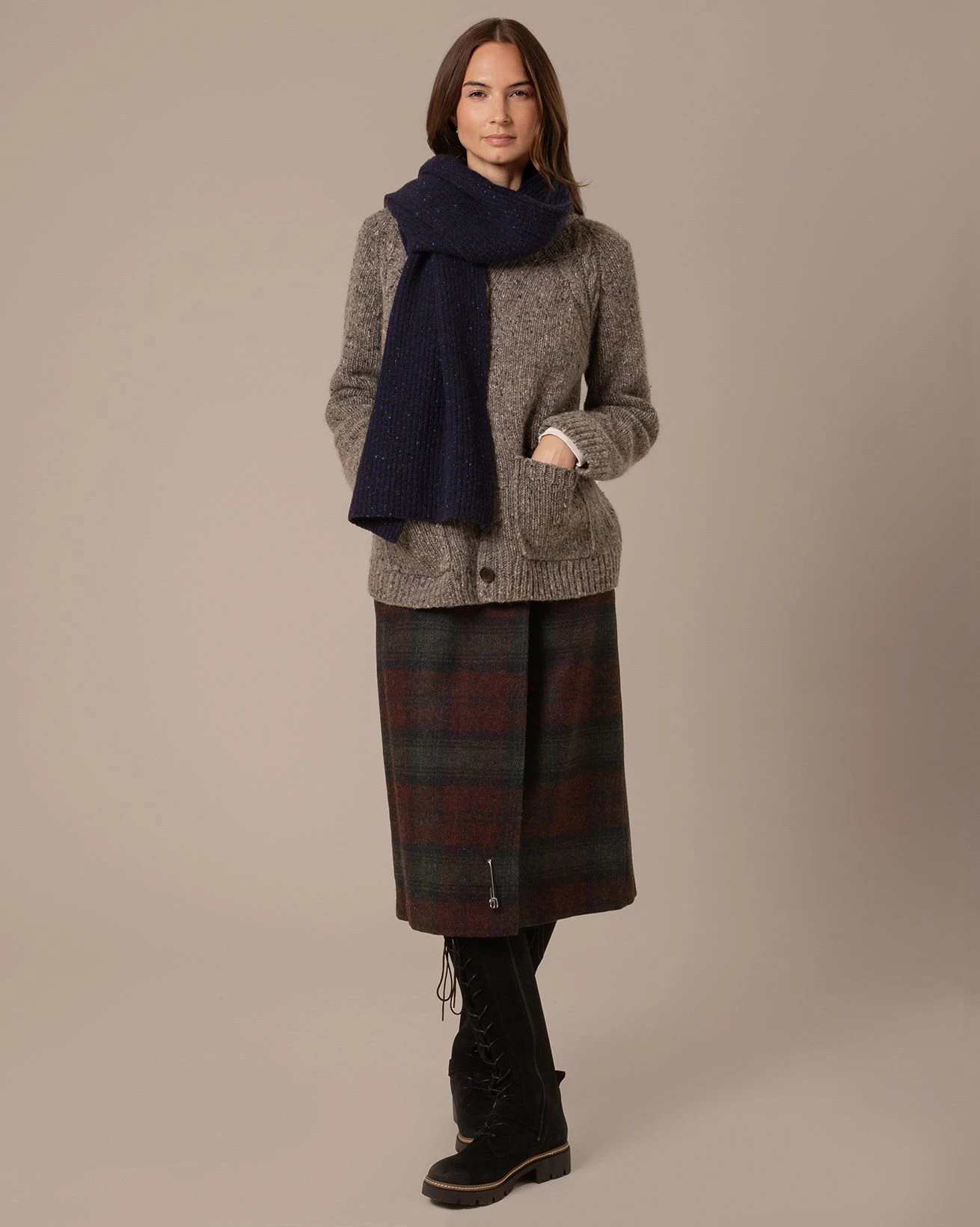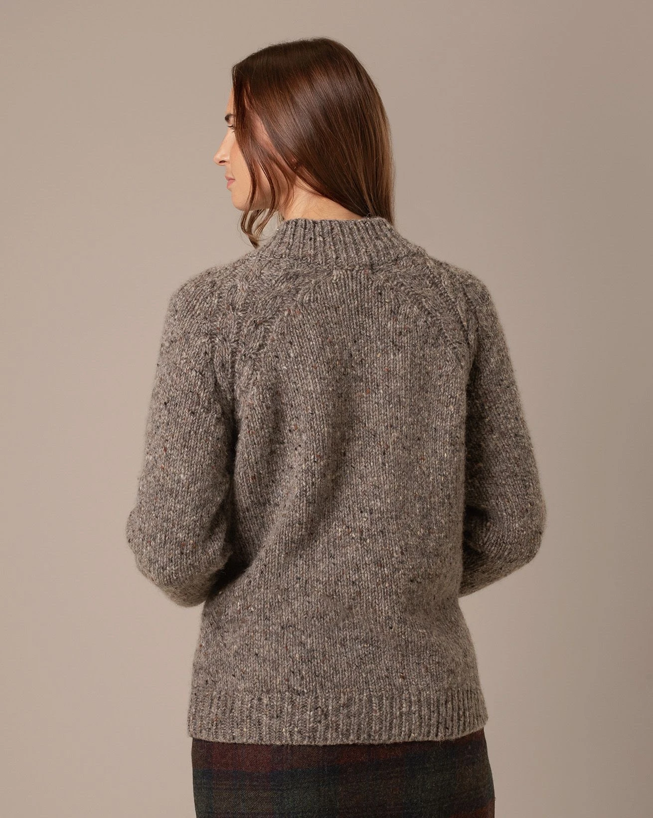 Perfect for wrapping up against cold winds, this warm funnel neck cardigan is crafted in a chunky weight Donegal yarn with patch pockets and ribbed cuffs, collar and hem. Details include cabling down the Raglan sleeve seam and Corozo buttons running down the front to fasten.