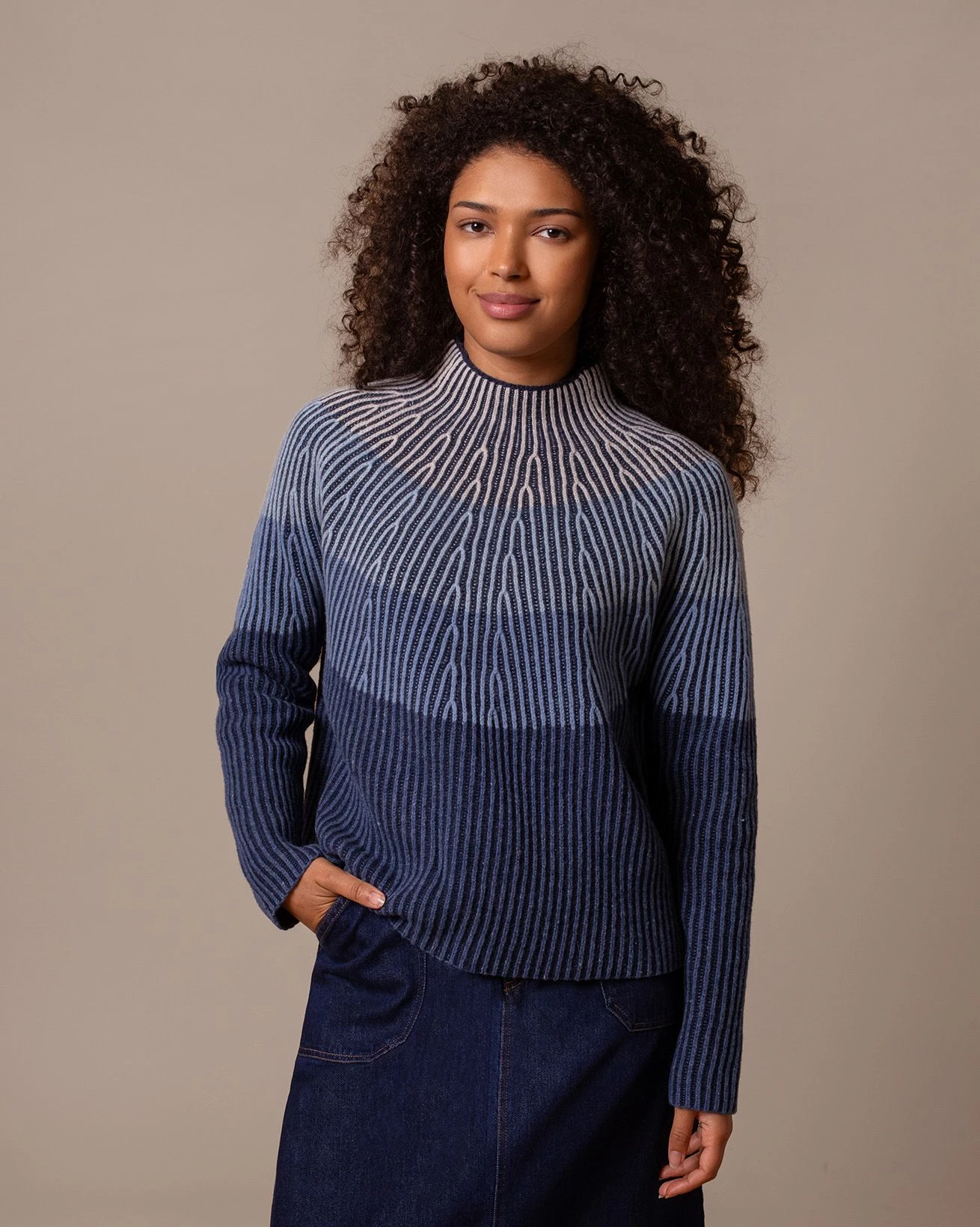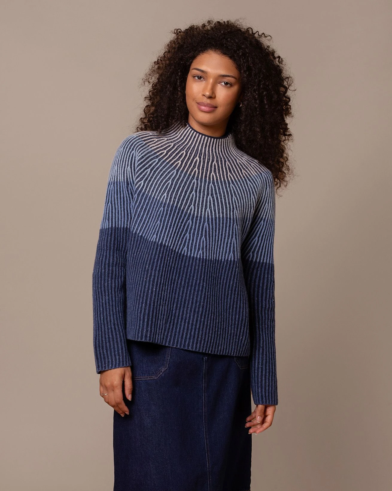 Knitted from pure lambswool, this jumper features a ribbed construction with subtle stitch detailing across the yoke. The plaited ombre-effect creates a tonal blue gradient for added depth. Designed in a boxy shape with wide sleeves and a funnel neck for a comfortable, modern fit.