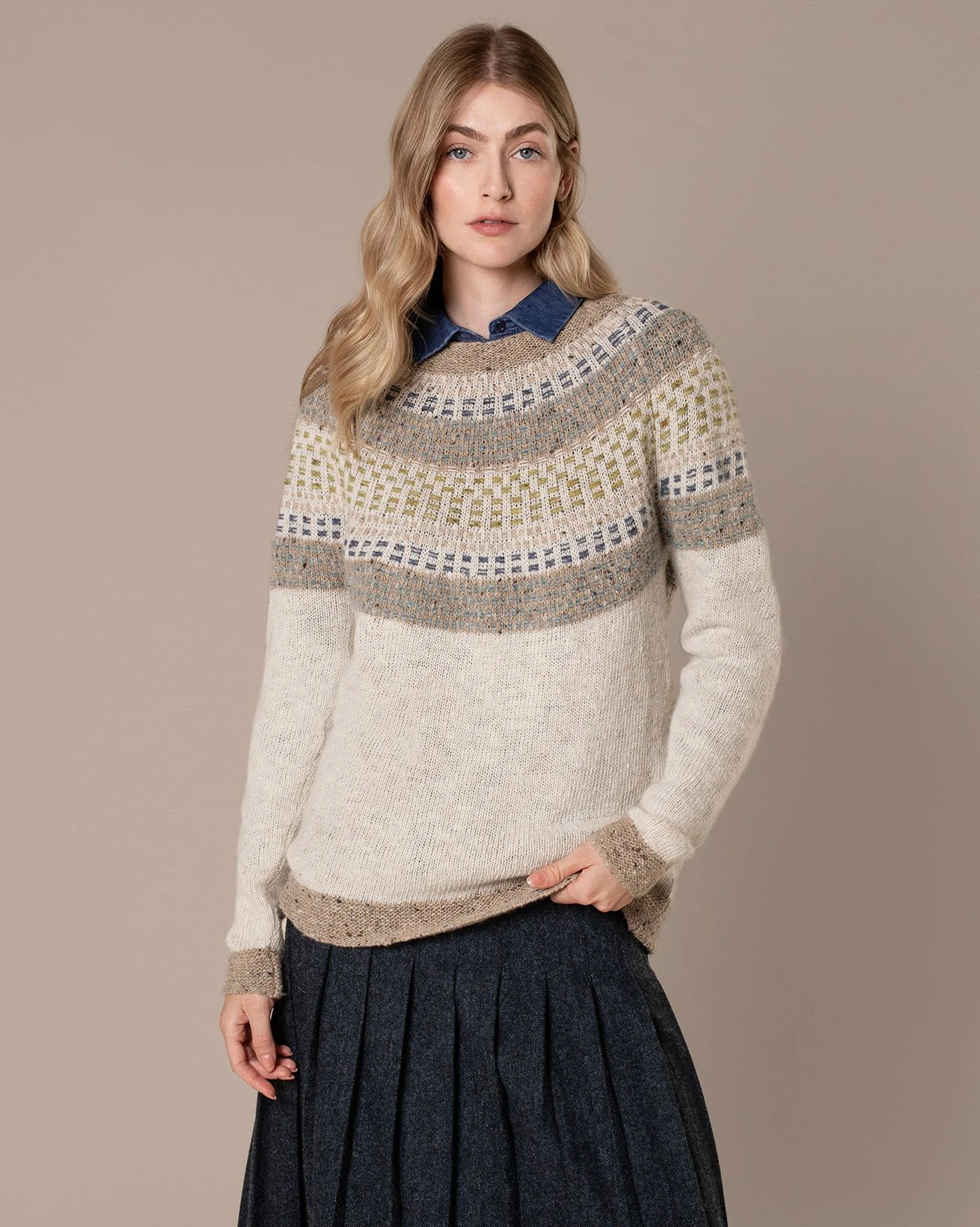 Our designers have used a pretty float-stitch detail to give the curved yoke a little extra charm, while the crew neckline, hem and cuffs are all designed with a purl knit for subtle contrast.
