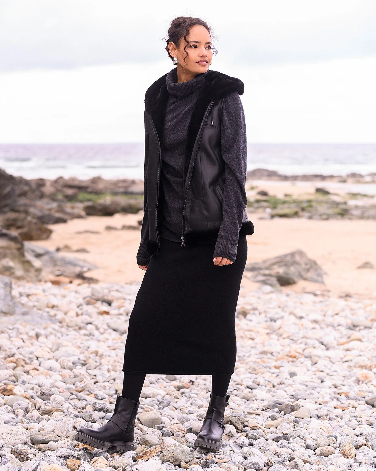 A stylish and practical piece for the colder seasons, our hooded shearling bodywarmer has a classic hip length, straight body fit. It’s sleeveless design allows for more manouverability whilst still keeping your core toasty. Features include a cosy, shearling lined hood with cotton cord drawstring ties, a chunky front zip, welt side pockets and turn back facings around the hood and hem edge to show off the curly wool. Wear over a thin layer on milder days or pair with a knitted jumper for extra winter warmth.