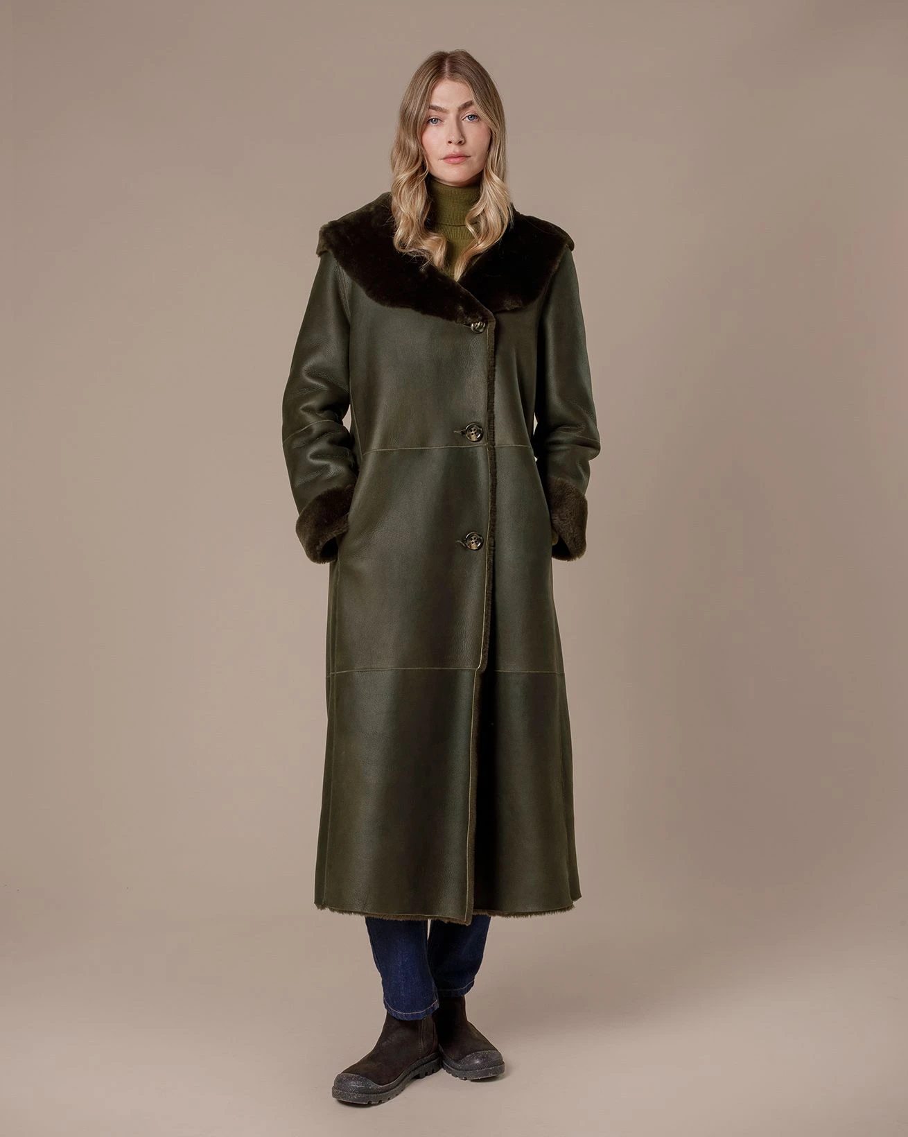 This luxurious hooded wrap coat, made in Britain from Merino Sheepskin, features a dramatic oversized hooded neckline. It offers a wrap-over front with horn button fastening and presents a full-length design.