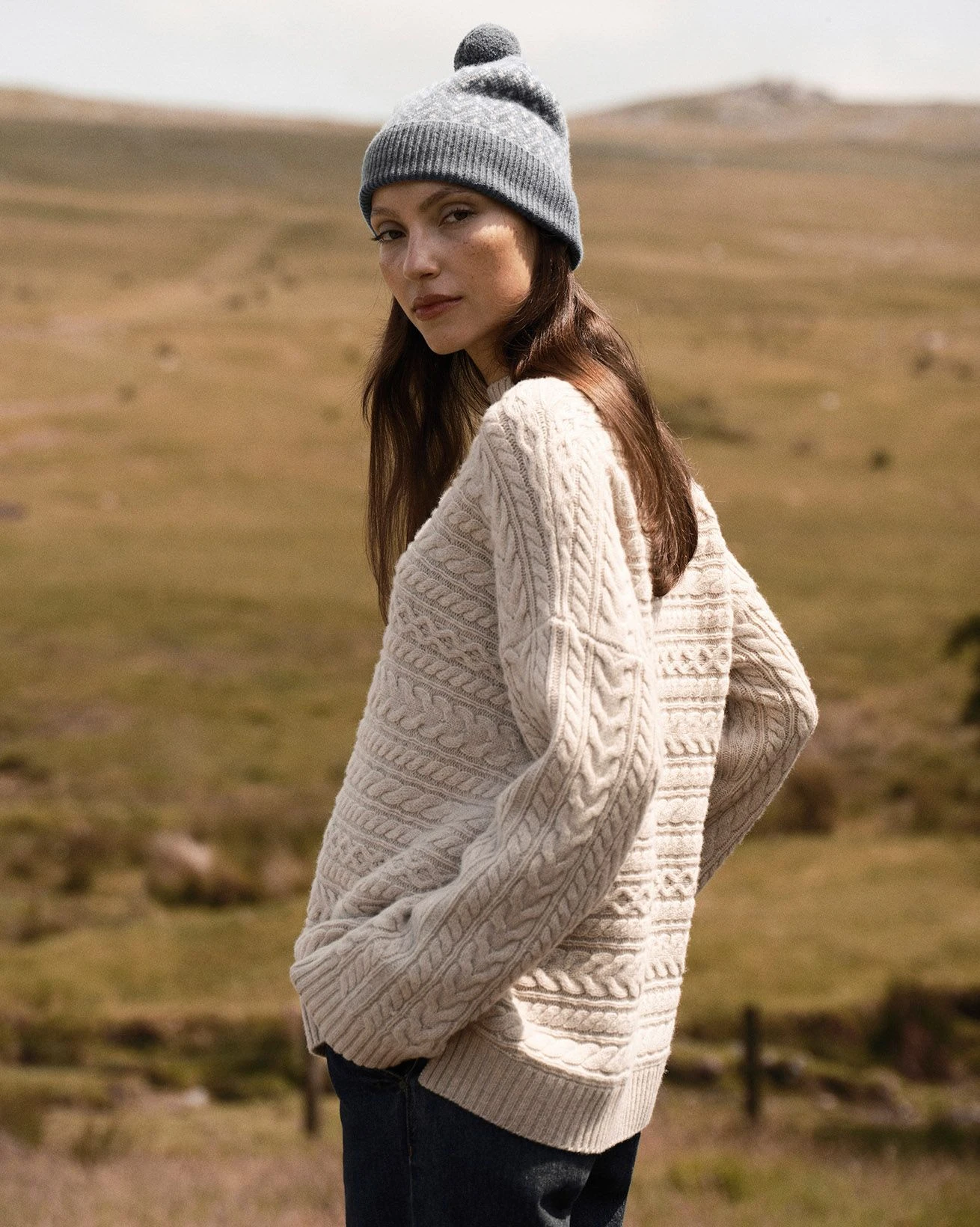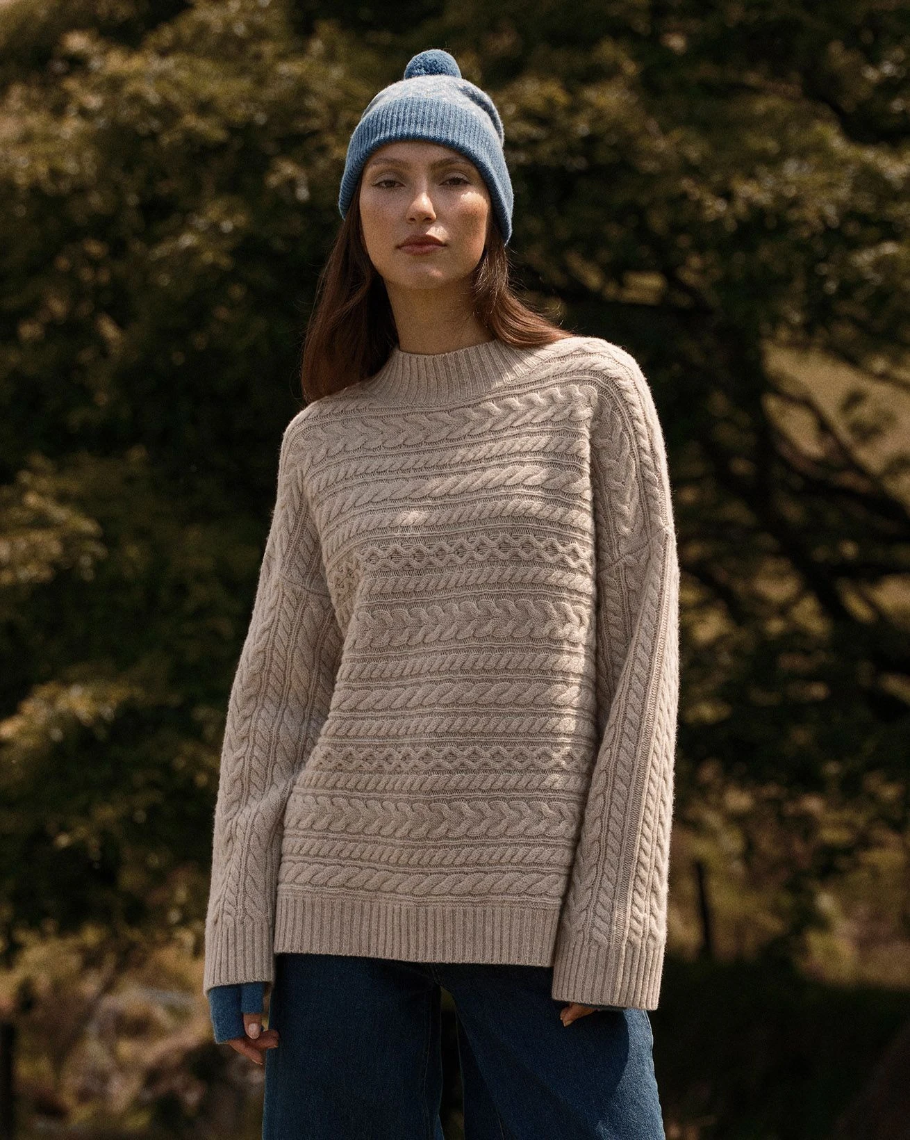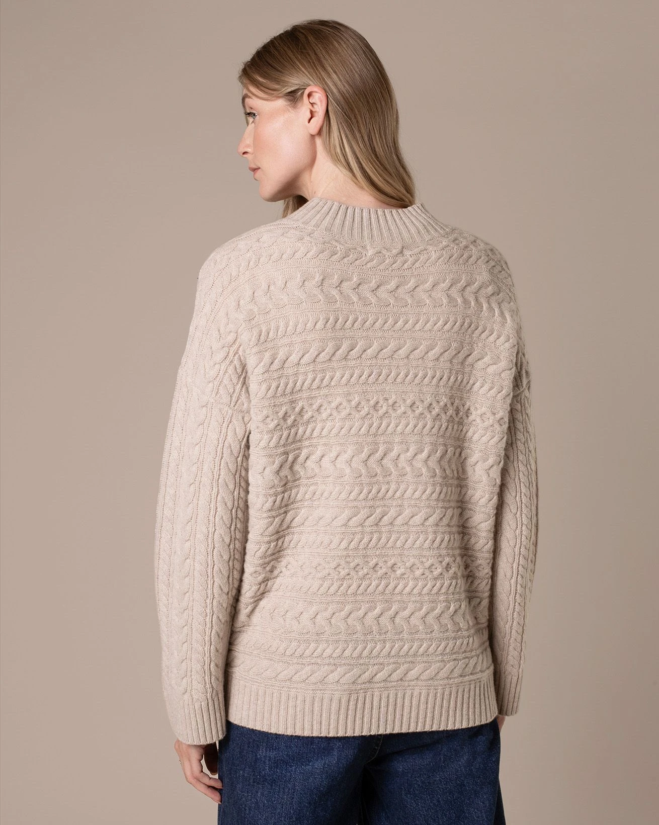 The Horizontal Cable Sweater is made from soft merino lambswool, featuring a funnel neck and ribbed trims. It showcases a horizontal cable design with a contemporary twist, offering a boxy fit, slightly longer length, drop shoulders, and wide sleeves for a modern silhouette.