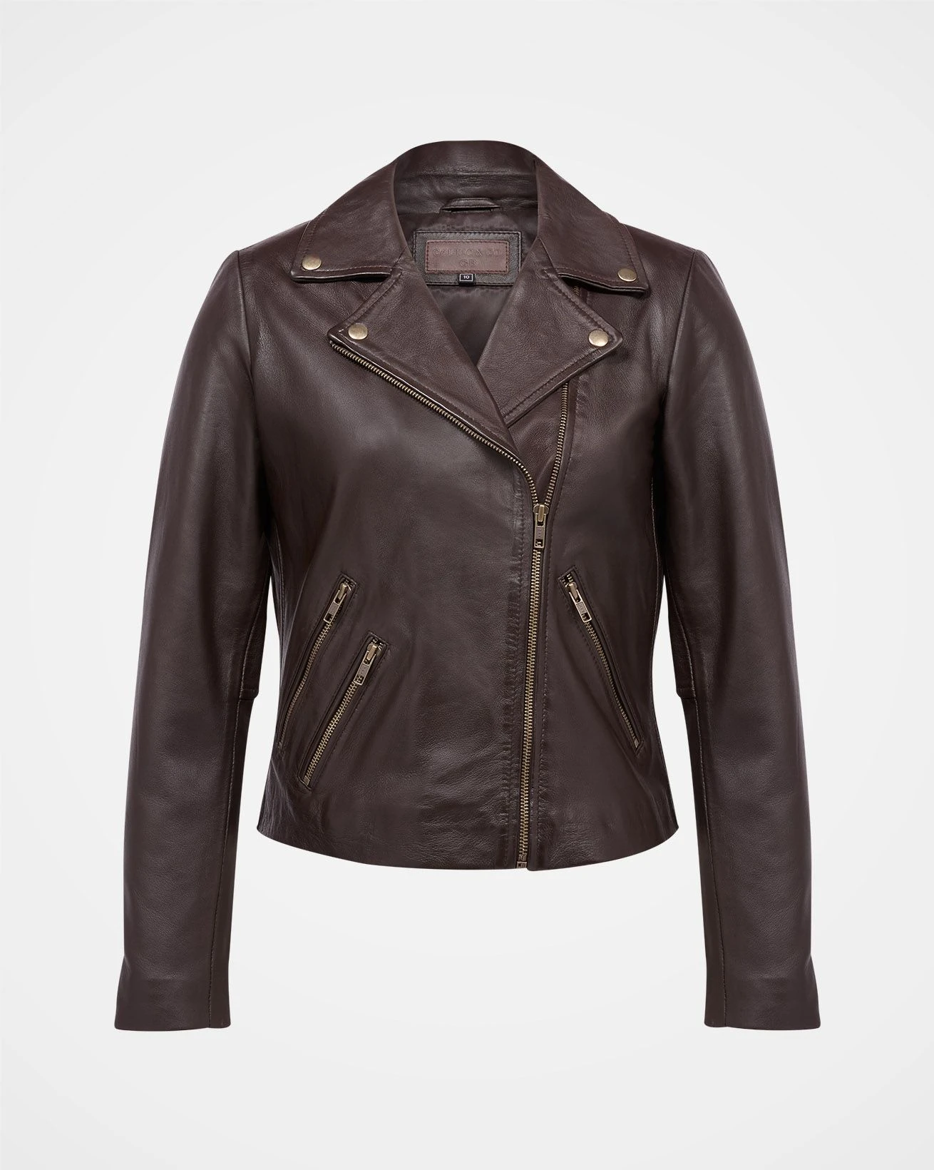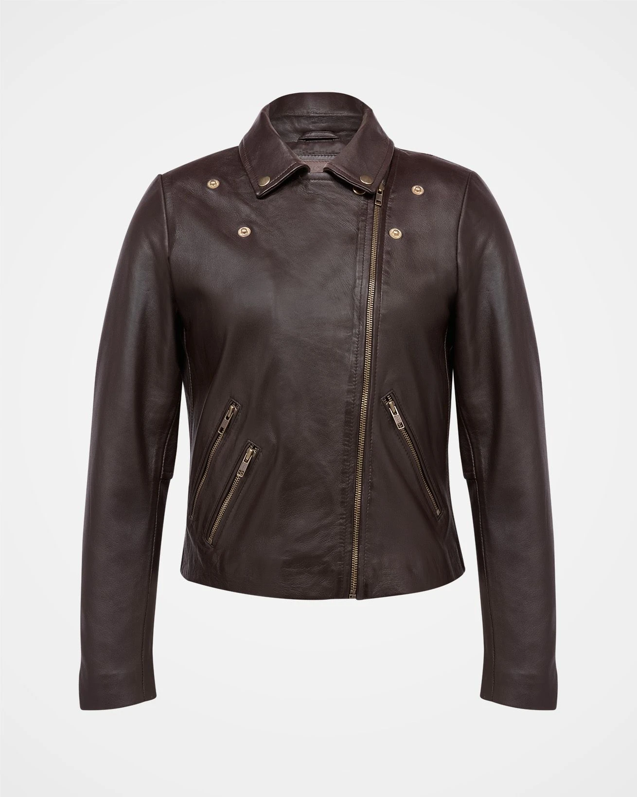 A classic biker style leather jacket with zipped pockets and popper stud detail on the collar lapels. Providing a slim, neat fit, the off-centre zip adds a flattering element.