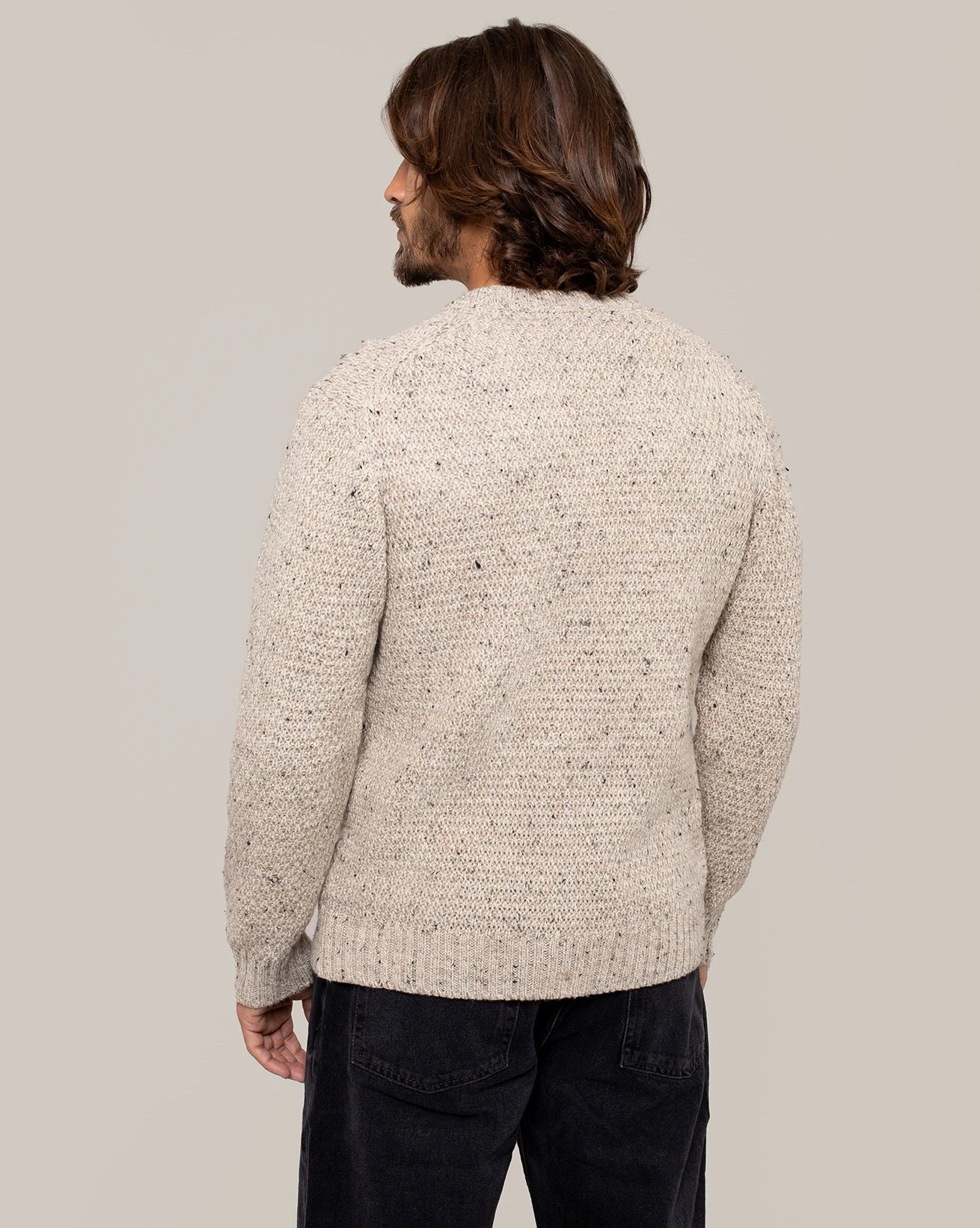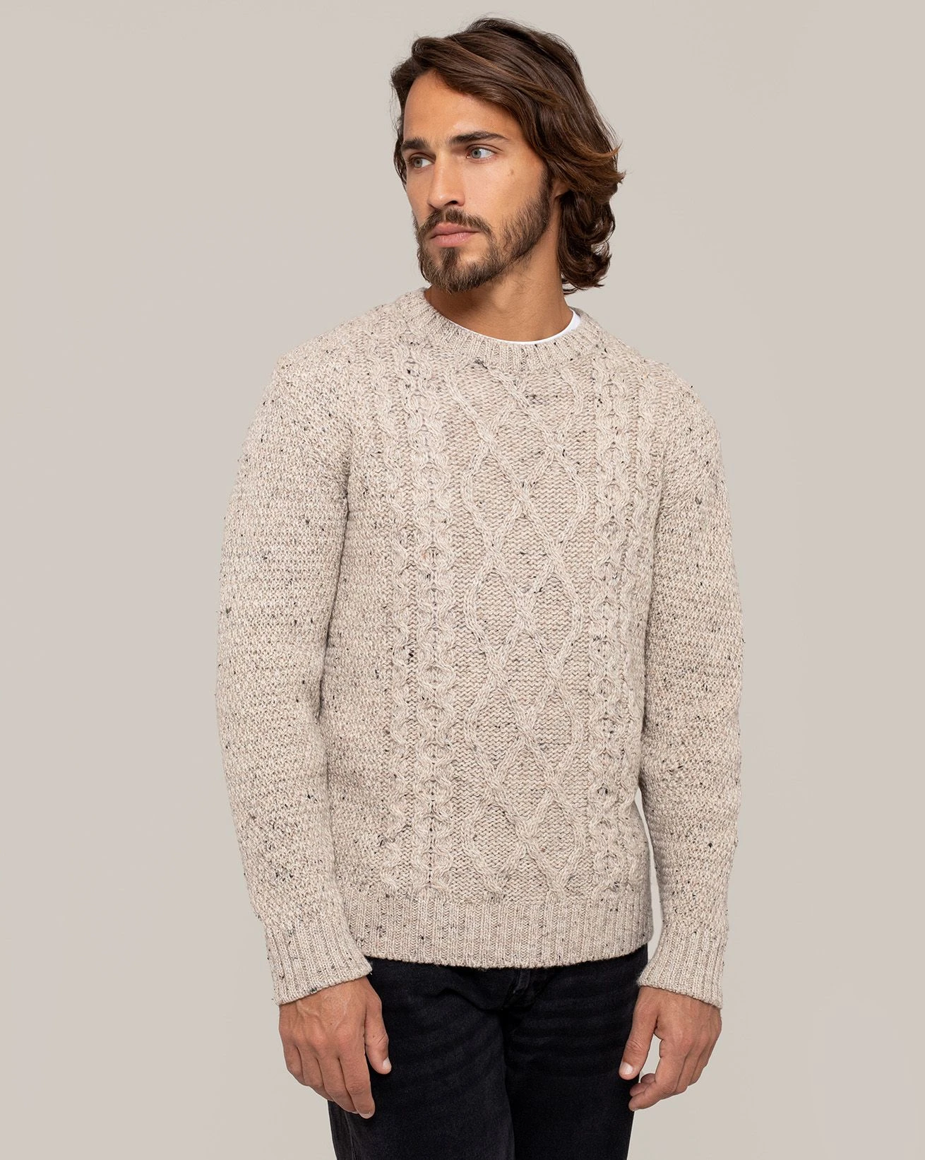 Crafted in 100% Merino wool with a flecked oatmeal hue, this piece introduces a whole lot of textural interest with chunky cable structuring running through the centre.