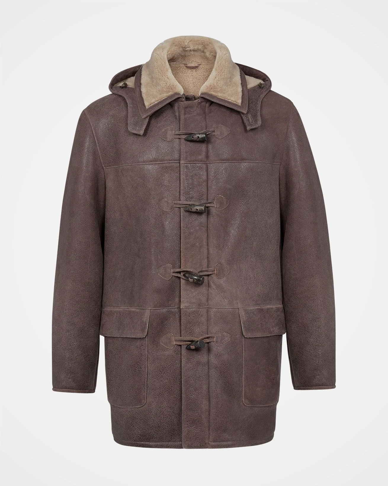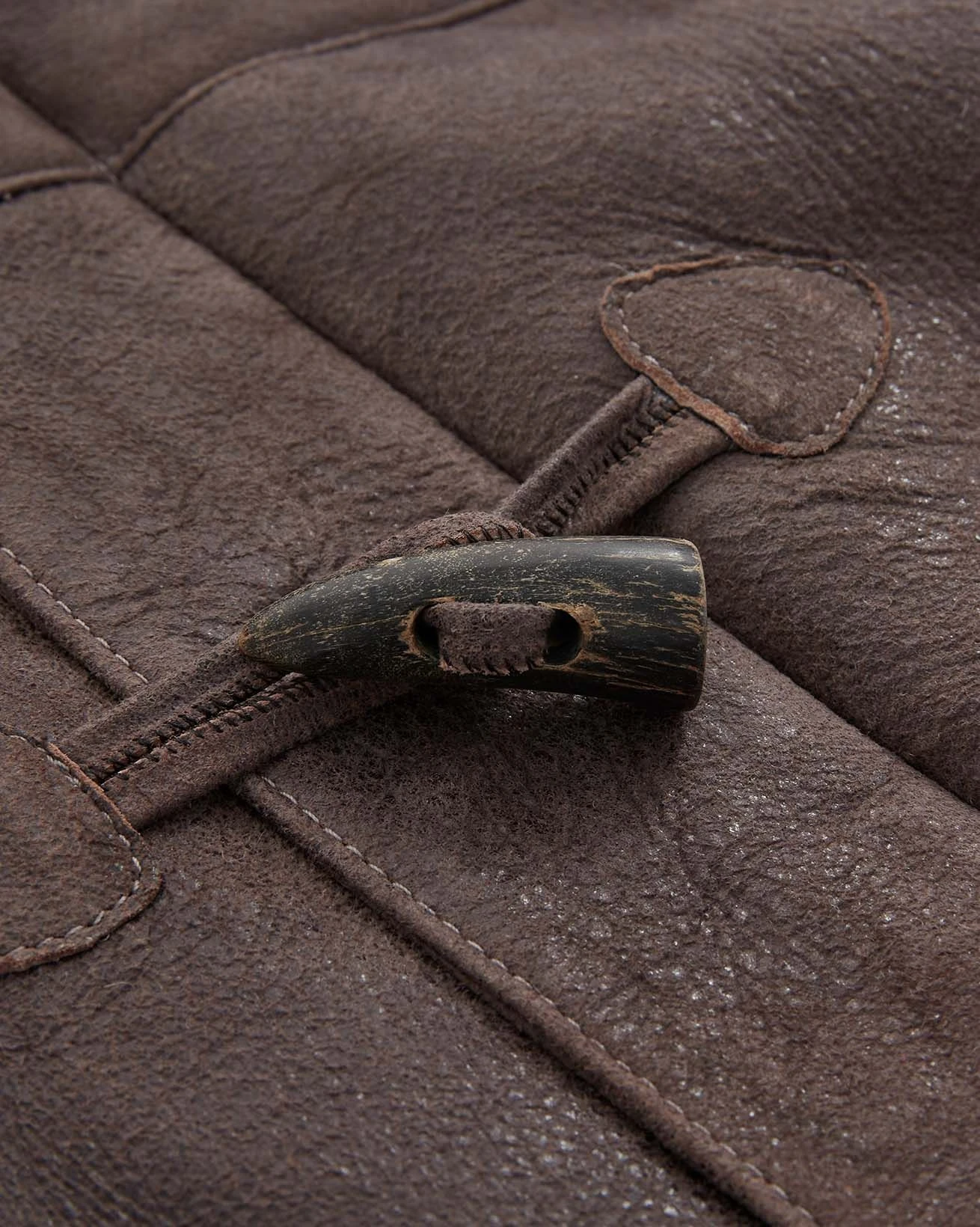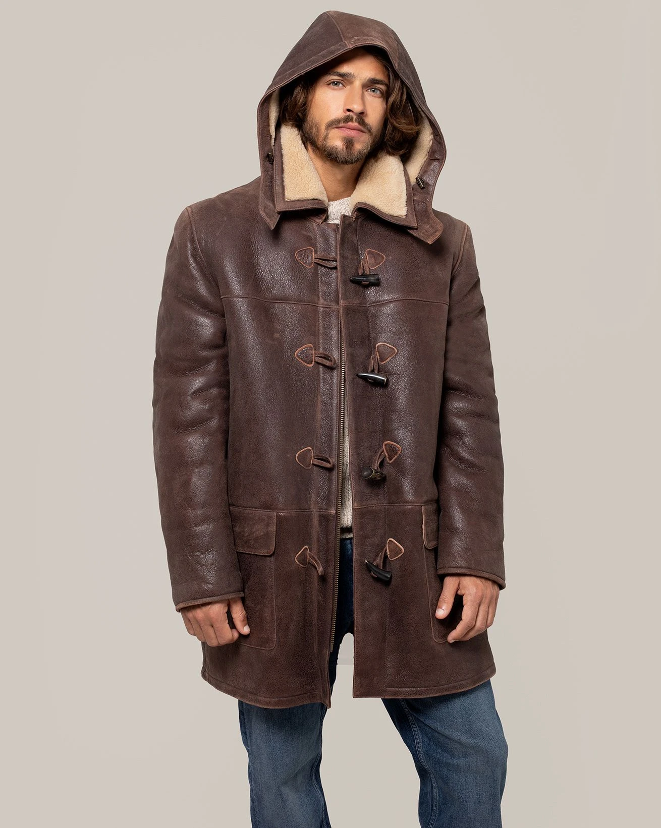 We’ve crafted it in rich leather with an antiqued finish and short, curly wool at the interior. Authentic horn toggles secure through the front with the benefit of an additional zip to keep the elements out.