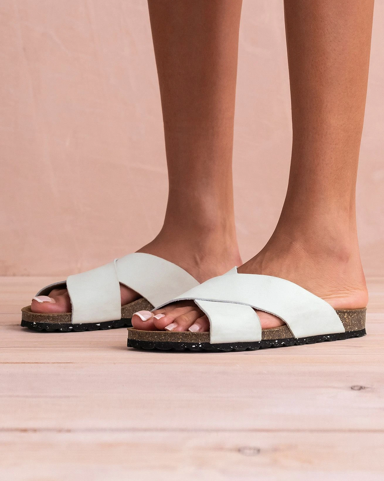 This classic slip-on slide sandal features wide crossover straps made of rich nubuck. The flat sole is constructed with moulded cork, ensuring a supportive and comfortable fit, while the suede lining adds to the overall luxury. The recycled rubber outsole contains chips of recycled rubber, making it an responsible choice. The Nubuck Crossover Slide is perfect for those who appreciate classic style with a conscience.