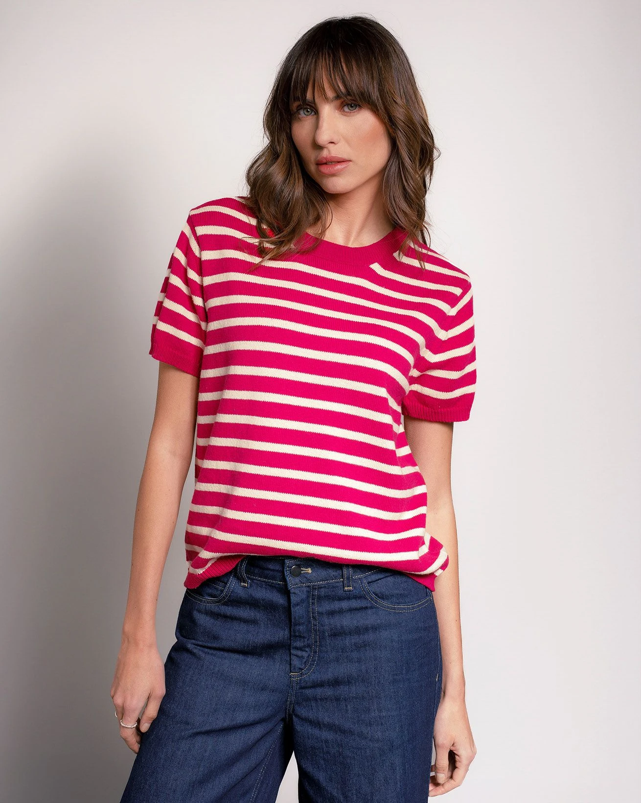 Featuring a classic crew neckline, this T-shirt showcases a straight fit with a striped pattern. The ribbed collar, cuffs, and hem add structure, making it a versatile piece for casual outfits.