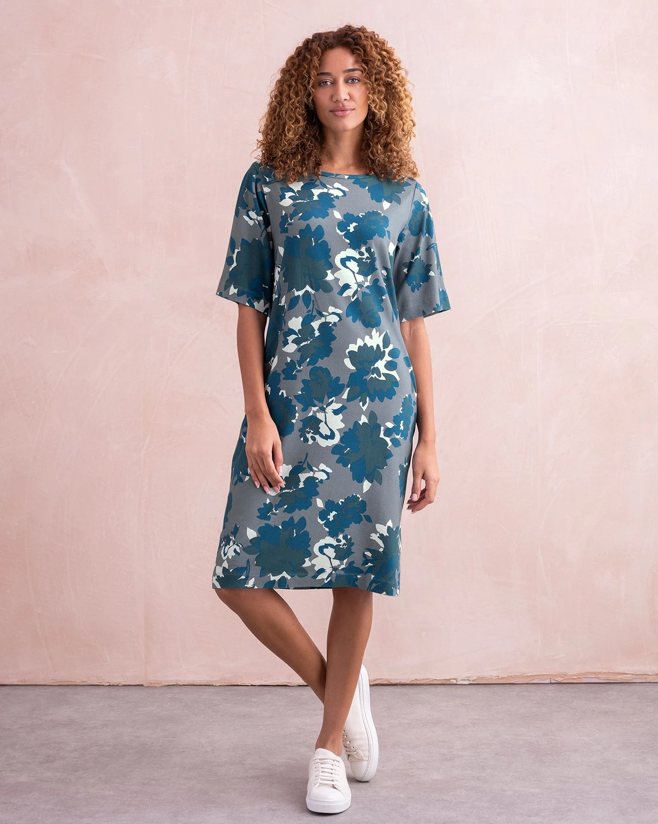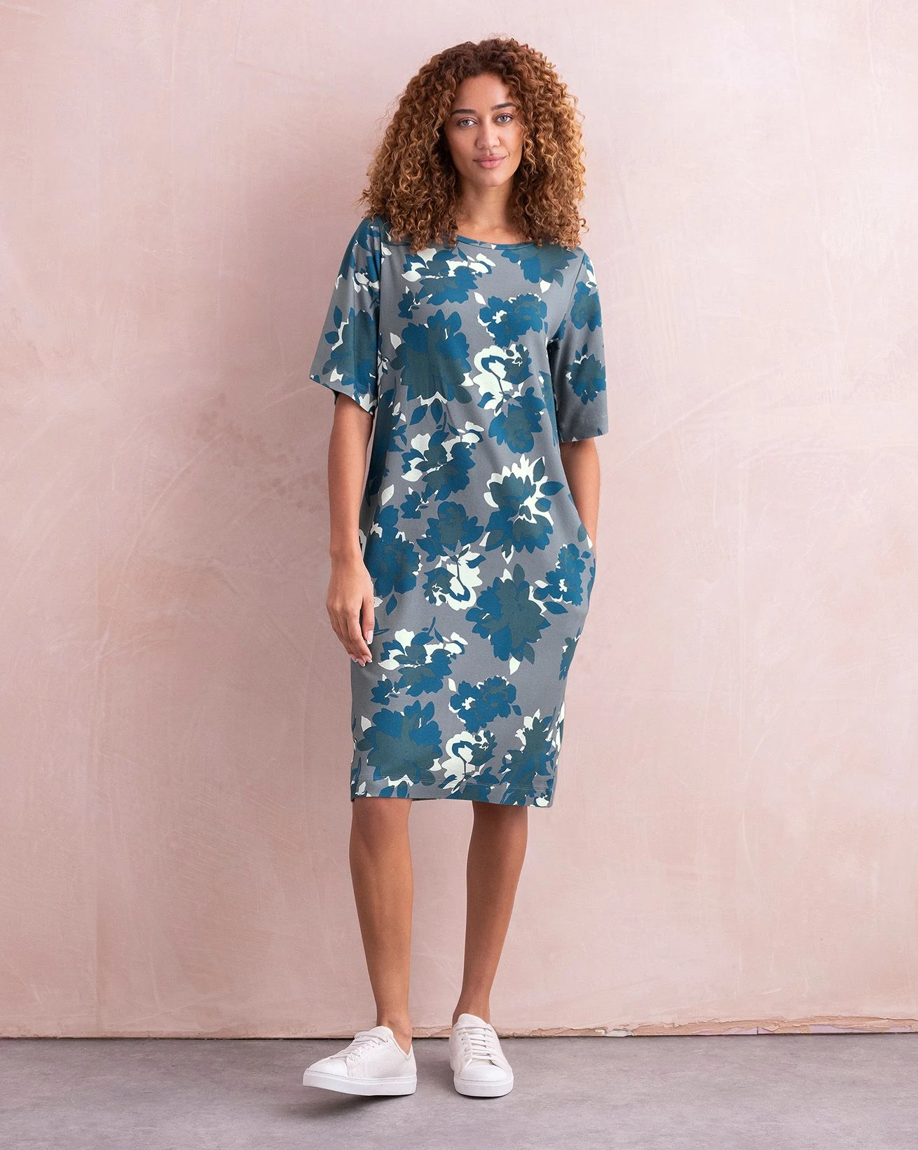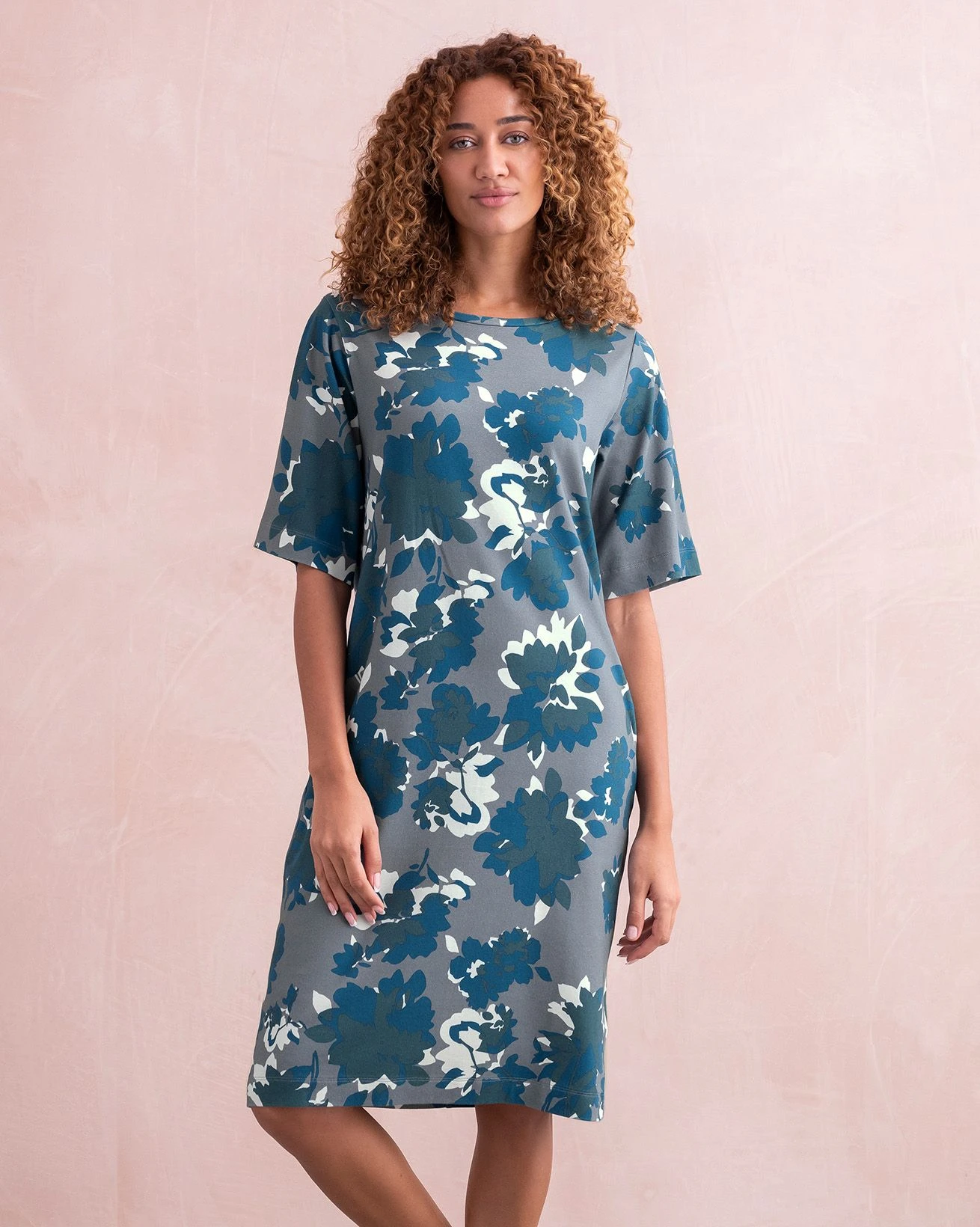 This knee length, straight fit t-shirt dress is easy to wear, effortless to style and extremely comfortable. The half length, flared sleeves are very flattering and add extra coverage. Featuring a crew neckline and side pockets, this dress was designed to be lived in. Wear with sneakers in town and bare feet at the beach.