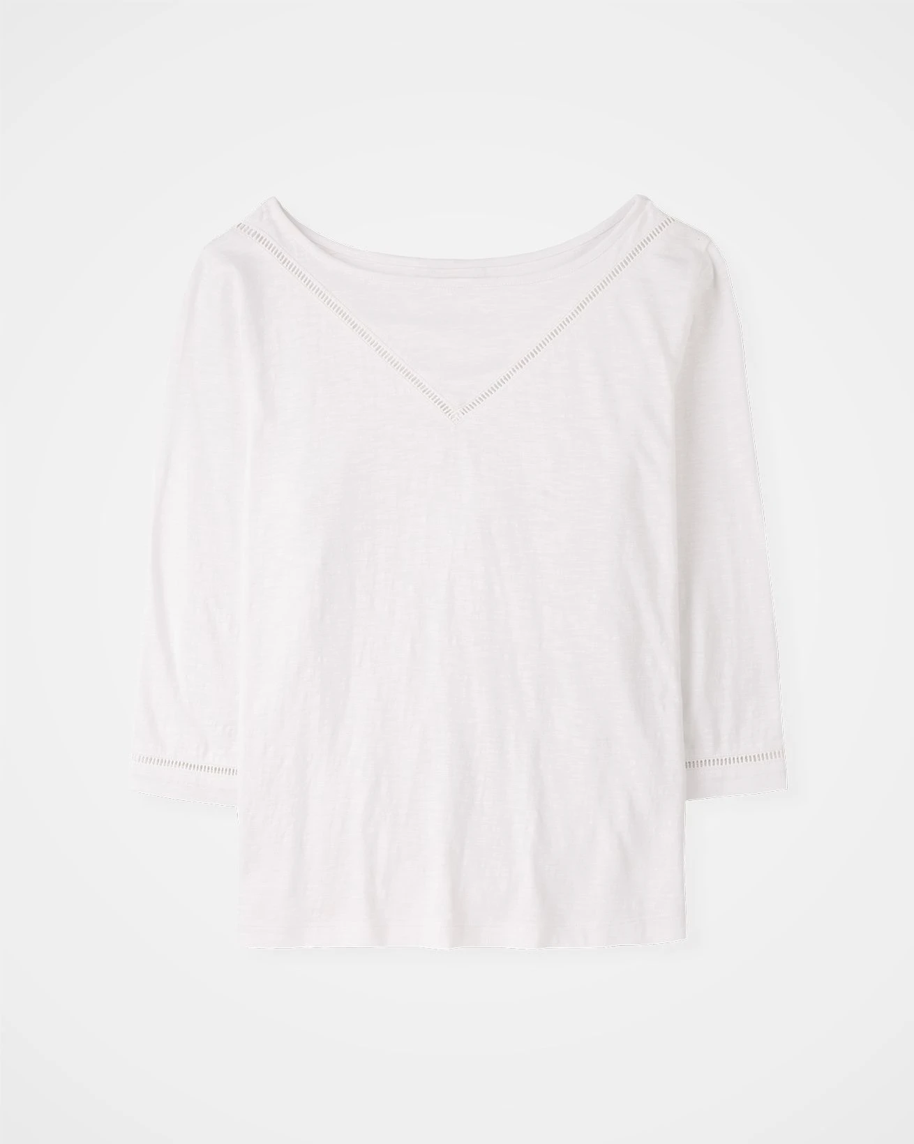This boat neckline top features a straight fit with 3/4 length sleeves, enhanced by a stylish ladder trim detail. Crafted for comfort, it’s a versatile piece that adds a touch of sophistication to any casual outfit.
