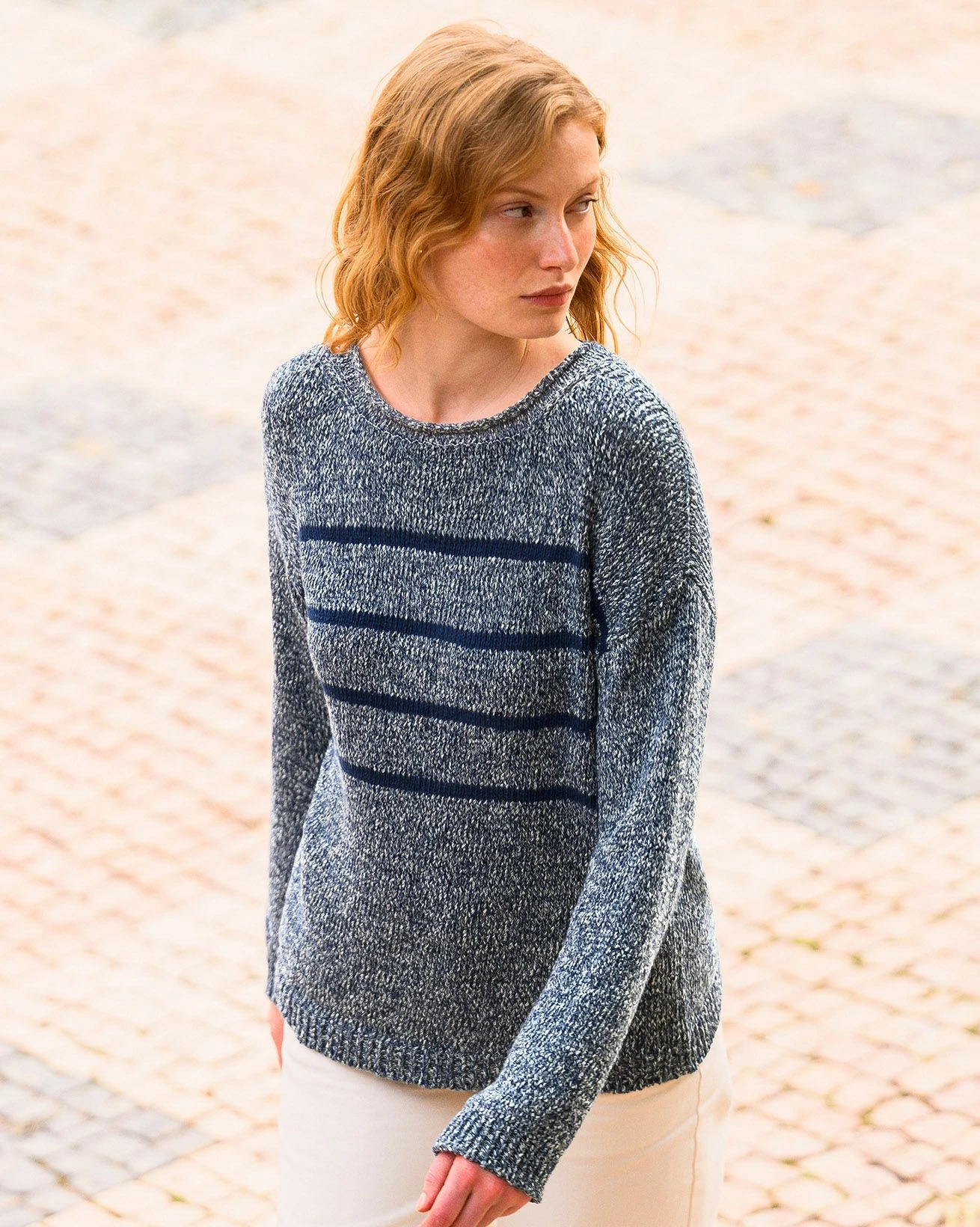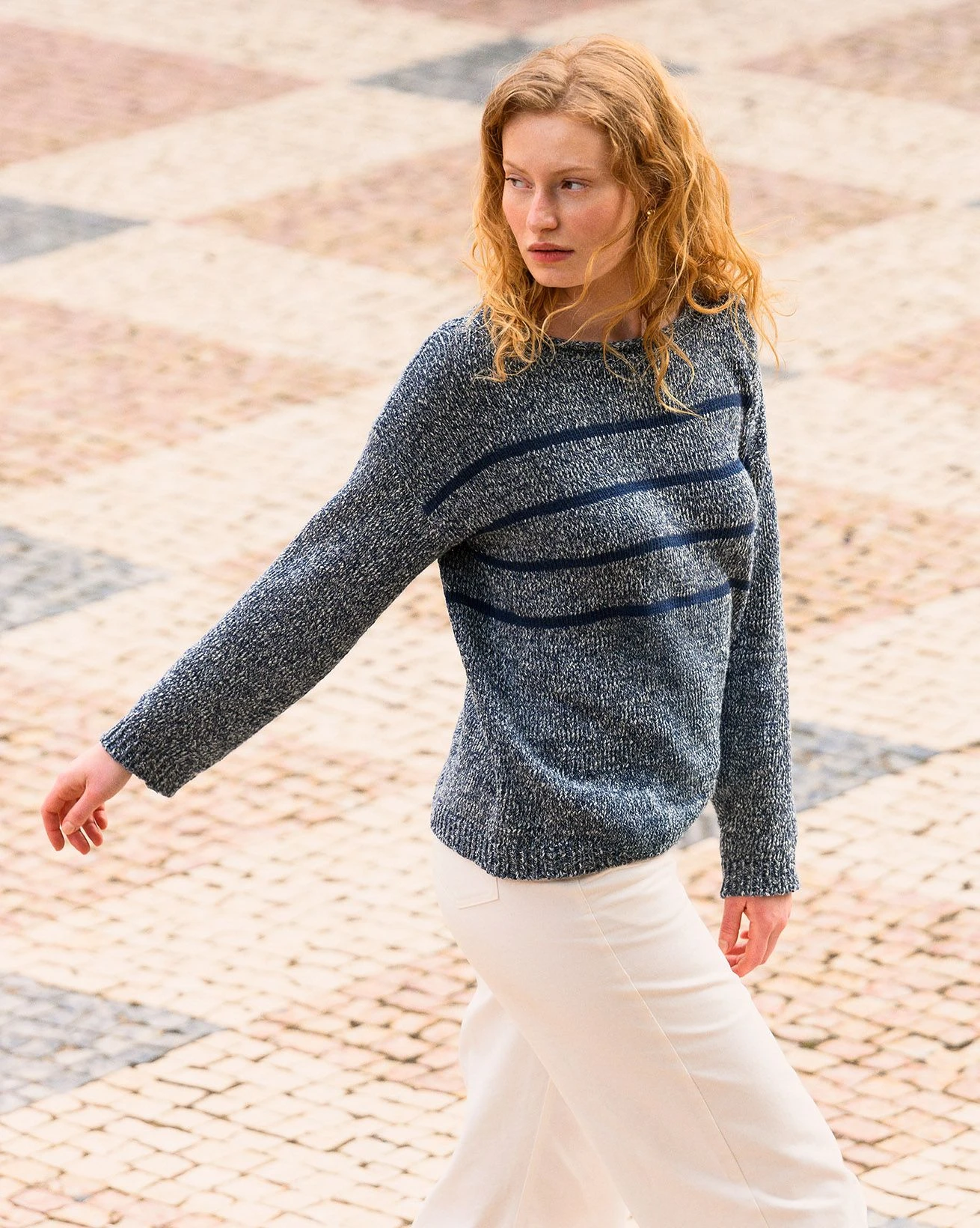 Crafted with a classic boat neckline and rolled edge detail, this Breton-inspired sweater is designed with a relaxed, drop-shoulder fit and finished with ribbed cuffs and hem. The yarn twist adds depth and texture, perfect for layering or wearing on its own.