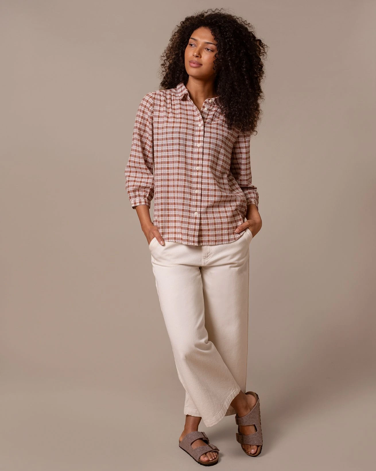Yarn-dyed check pattern in a textured woven fabric, combining classic design with tactile depth for a timeless look.