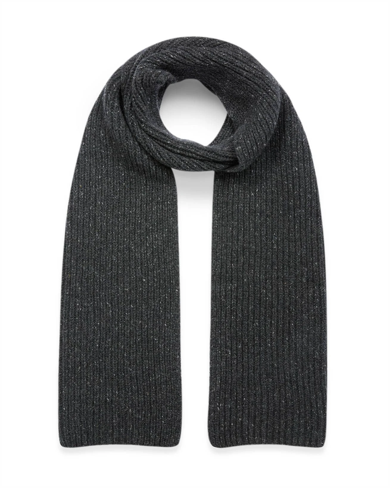 Made in Britain from recycled merino and cashmere, this rectangular scarf features a ribbed stitch pattern and flecked yarn for subtle texture. Soft and warm, it provides a sustainable option for everyday layering.