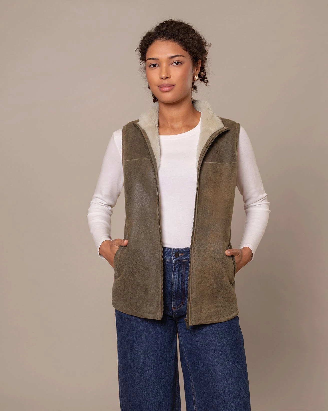 Perfect for keeping your core wonderfully warm on transitional days, our bodywarmer is crafted in luxurious shearling with a peached, antiqued finish at the outer.