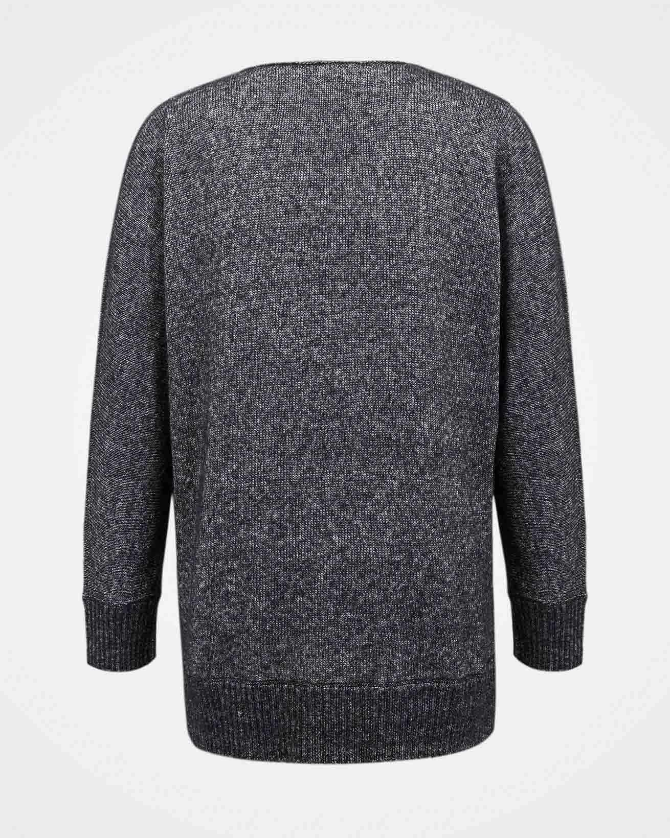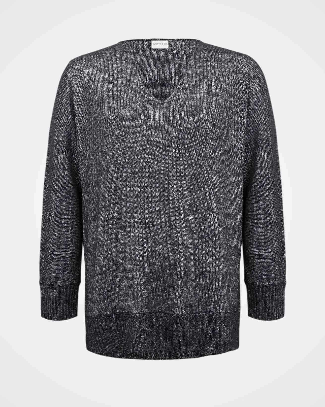 This loose fitting v-neck is the perfect sweater for Christmas Day! Adding sparkle to the festive season, it’s been crafted from a clever yarn with a subtle shimmer. Viscose is blended with alpaca to create a lofty, fluffy finish. This sweater is luxuriously cosy and warm, yet sophisticated and glamorous enough for the big day. Featuring a clean cast off edge, grown on sleeve, ribbed cuff and hem and no armhole seam.