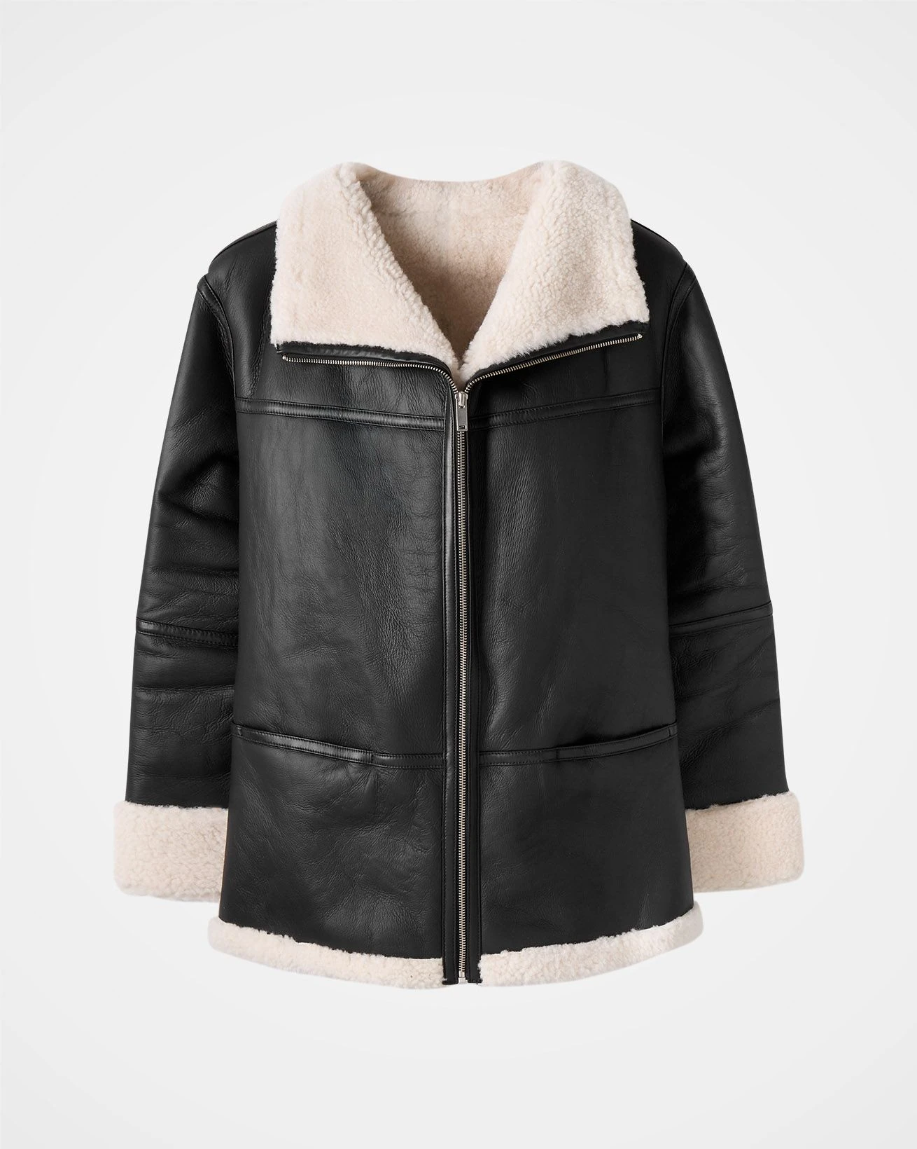 This shearling jacket features a funnel neckline and a relaxed, slouchy fit for casual comfort. Finished with a metal zip fastening at the front, along with pockets lined in shearling, combining style with functionality.