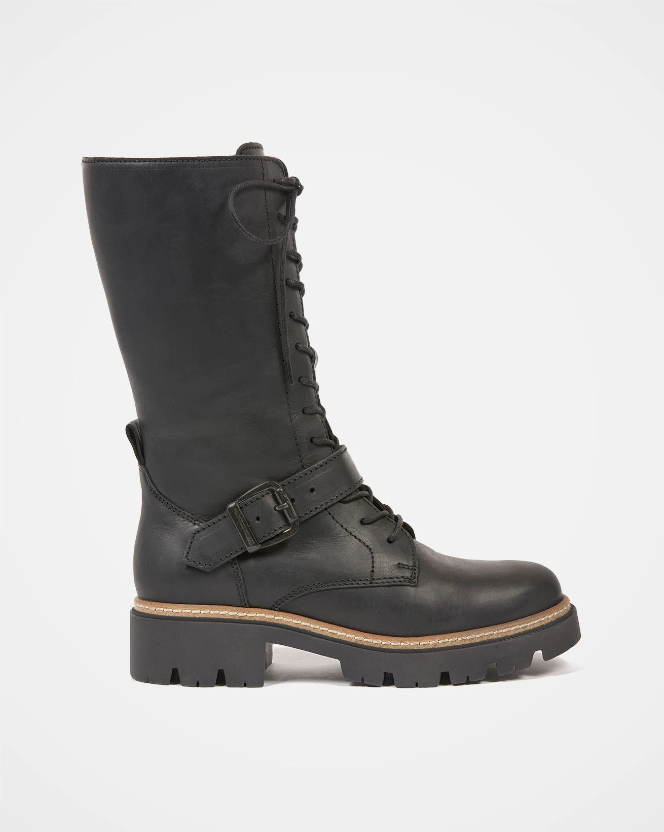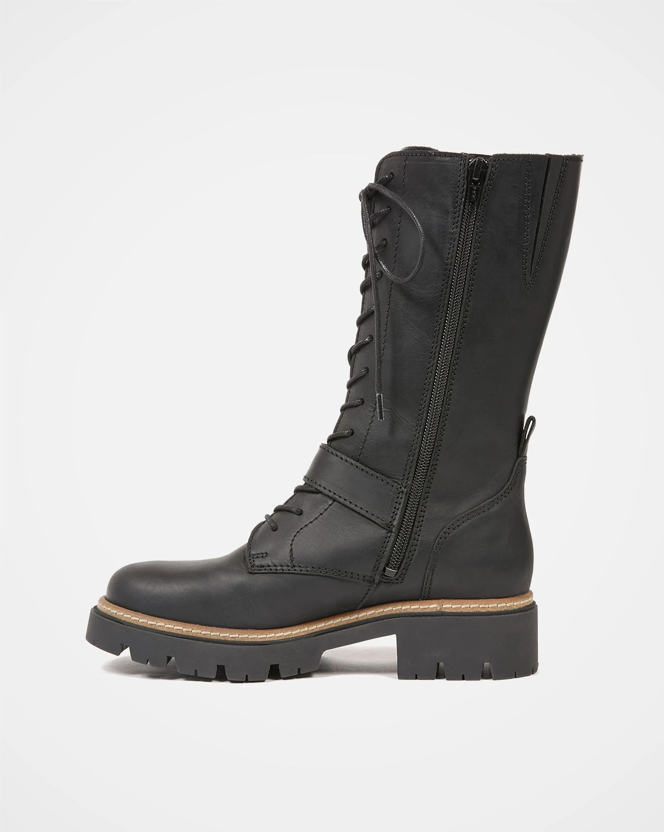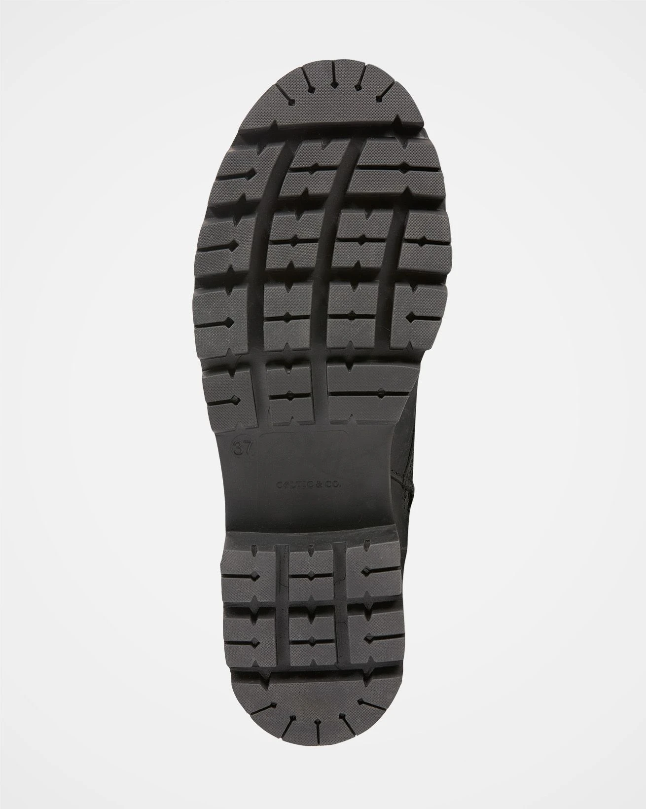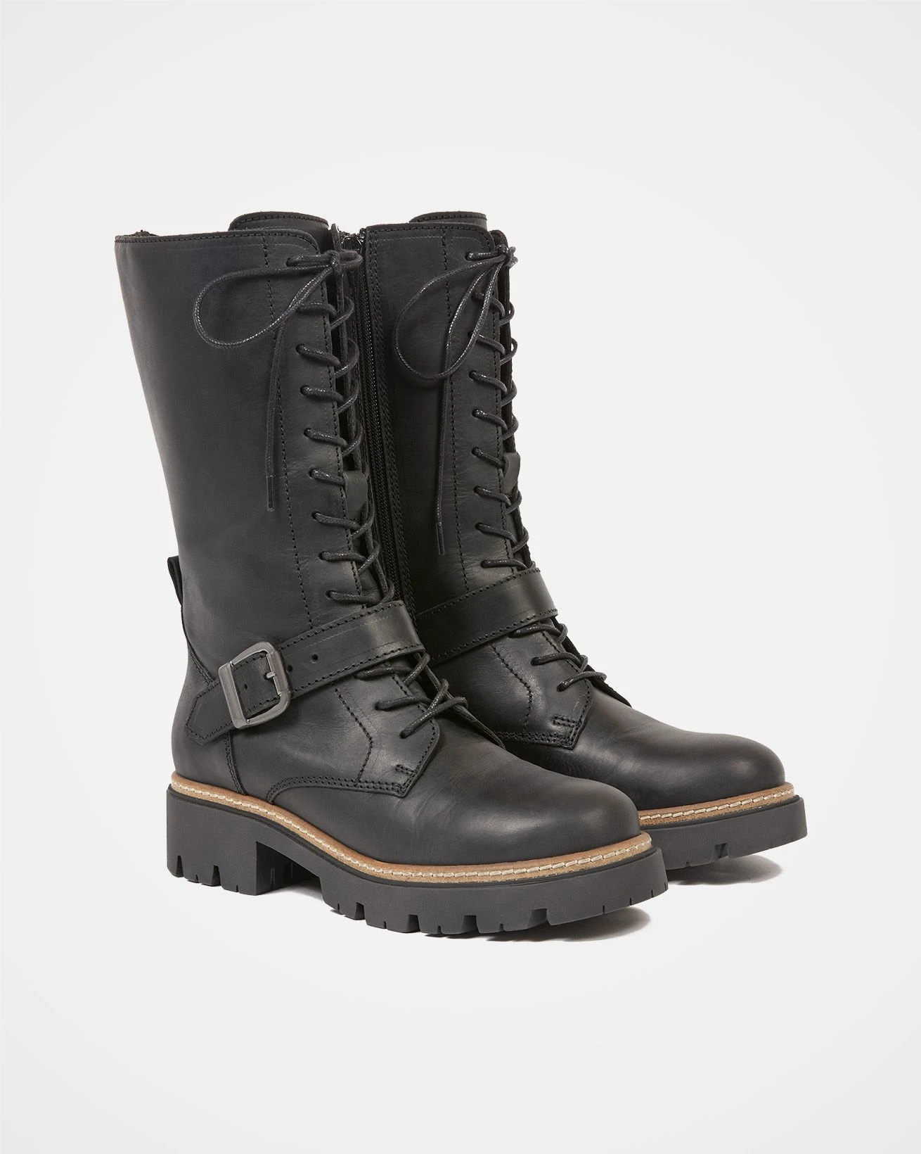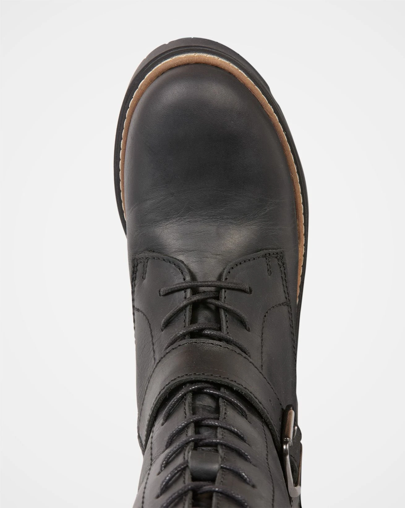 Comfortable and stylish, our tall lace up boot is a chic new take on our best selling styles. Made from rich rustic leather with hand finished burnishing and fully lined in vegetable tanned leather, these mid-calf length lace up boots are great for winter and beyond. Featuring a chunky recycled rubber cleated sole with deep leather welt to give a trendy edge to your wardrobe. Details include a buckle and strap across the top of the boot, plus an ankle pull tab and full length zip on the inner side for ease of wear.