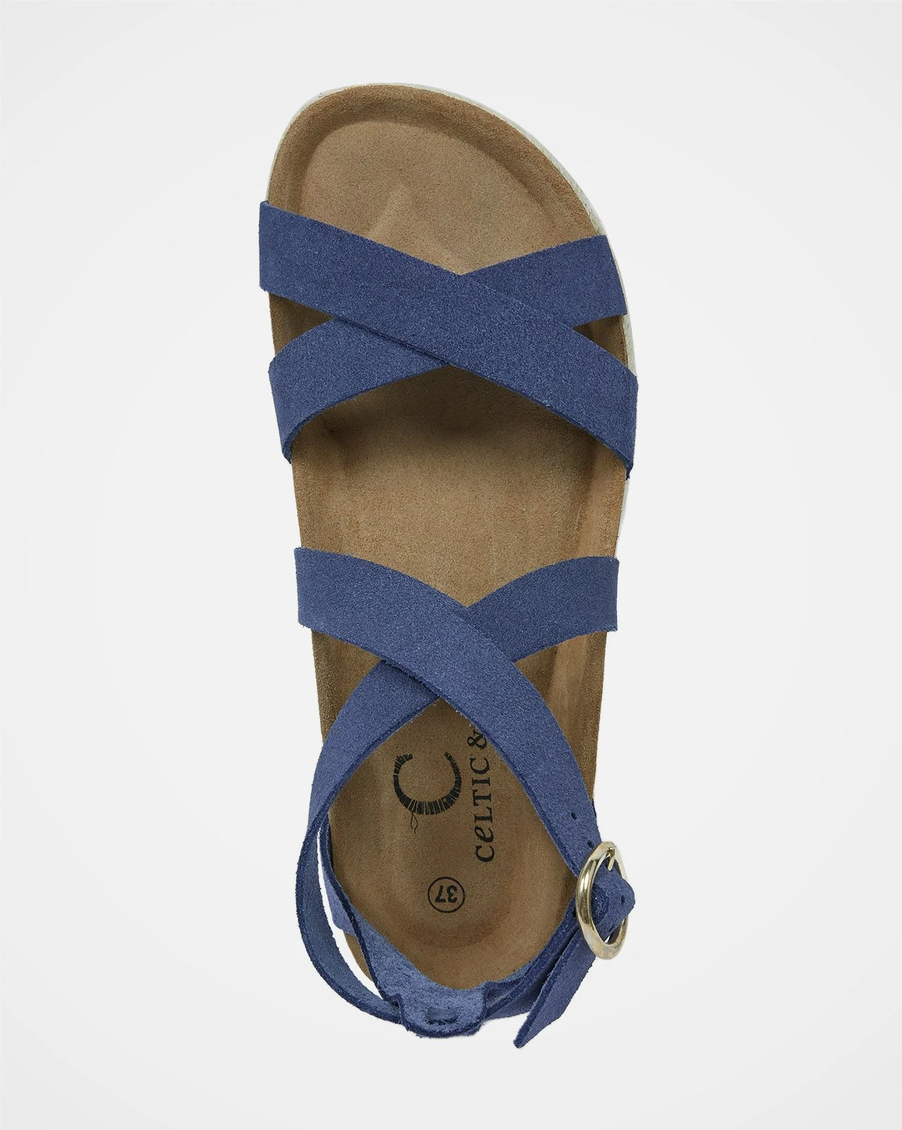This sandal features multiple suede straps, that crossover across the front of the foot and wrap-around the ankle, fastening with a round metal buckle. The flat sole unit is made of molded cork and lined with suede for a comfortable, supportive fit. The style features a low platform trimmed with plaited jute and a rubber sole.